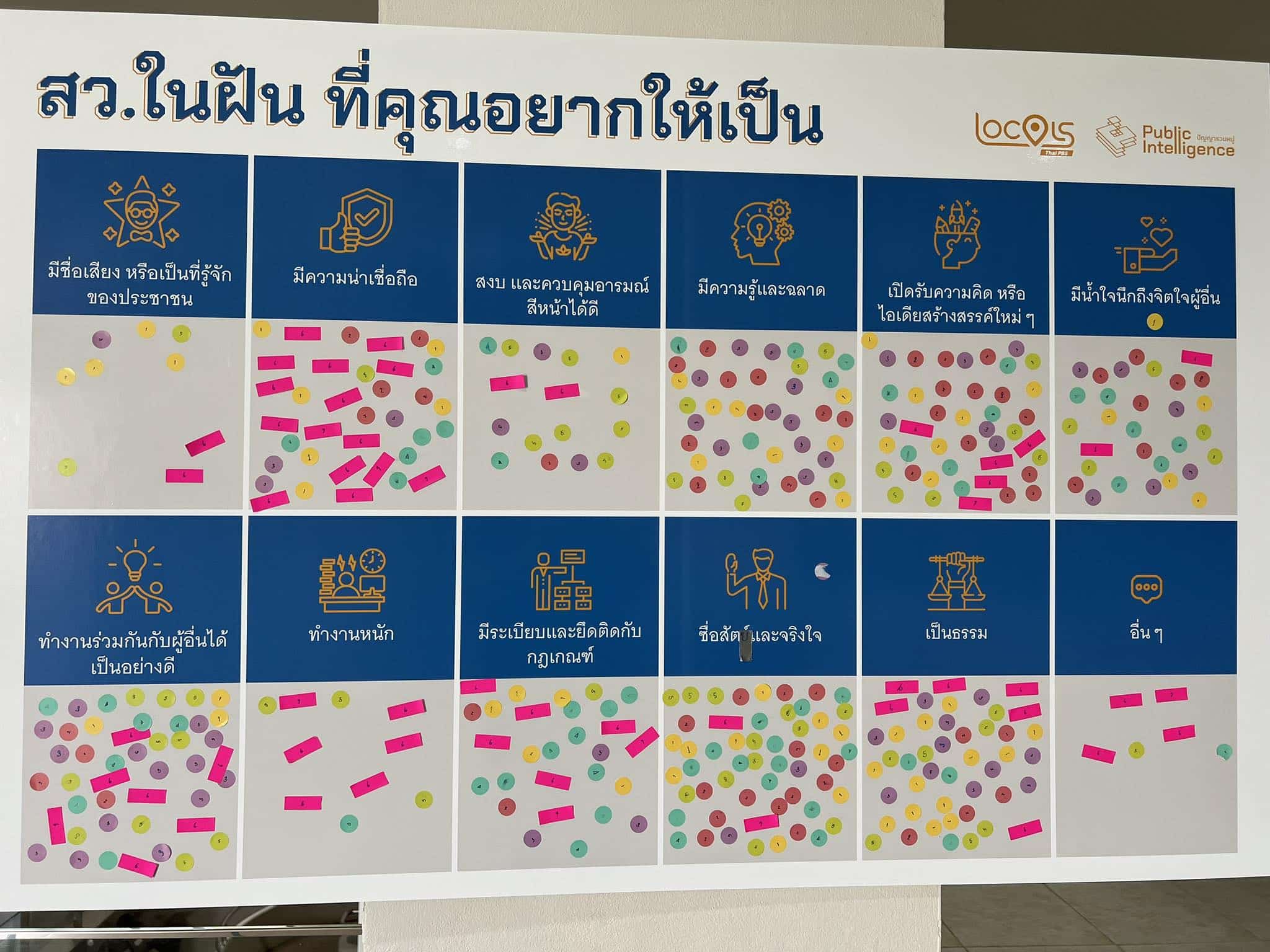 - การทำงานเพื่อประชาชน: ทำงานเพื่อประชาชน, ไม่หวังผลประโยชน์ส่วนตัว, รับฟังความคิดเห็นของประชาชน, เข้าถึงประชาชน, ยึดโยงถึงชาวบ้าน, เป็นปากเสียงให้ประชาชน, ทำงานเพื่อส่วนรวม, ไม่ทำงานเพื่อกลุ่มตัว, เป็นที่พึ่งของประชาชน, เห็นประโยชน์แก่พลเมือง